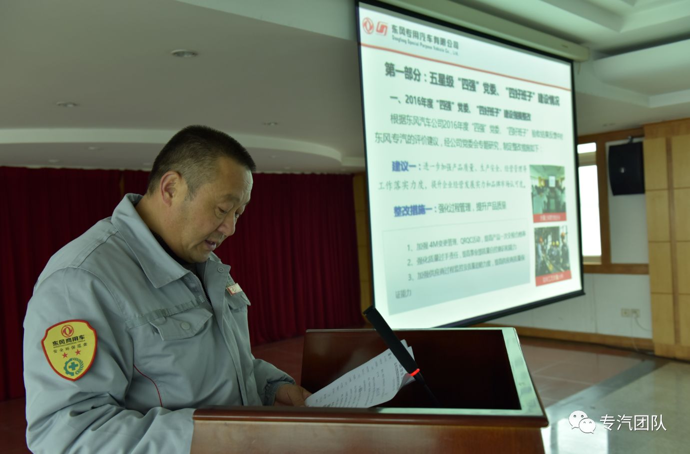 专汽公司党委书记康树春作2017年度“四强党委”、“四好”班子星级达标创建工作自评报告。一年来,公司党委党的十八届五中、六中全会精神为指导,围绕生产经营中心,以“党政同向、干群同心、工作同力、责任同担、成果同享”为工作方针,扎实推进“两学一做”学习教育和党建事业计划管理,党组织的政治核心作用得到充分发挥,班子的自身建设得到进一步加强,为公司经营发展营造良好的生产环境。